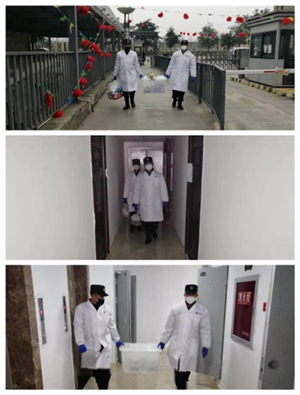 安保人员为居家(周转房)隔离观察职工及家属送餐到门口