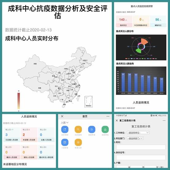 针对传统手段开展人员摸排统计的工作量大、效率偏低等问题,中心网络安全事业部积极出谋划策,正着手研究开发中心疫情防控信息化系统。据悉,该系统通过与微信公众号的绑定,可实现员工实时分布、重点疫区出行情况、重点关注人群统计分析、员工返岗情况、出行路线图等的查看,以及各类数据表格的在线填报和汇总统计等功能,将极大的提高工作效率。该系统目前已完成框架搭建和功能测试,将于近期上线运行。