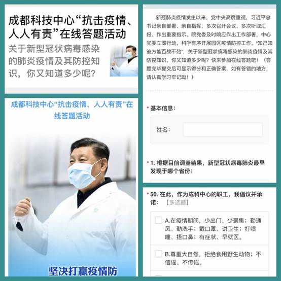 2月12日,成科中心策划开展了“抗击疫情 人人有责”在线答题,通过设计微信小程序,面向全体职工发起了疫情防控知识答题和倡议活动,把党中央决策部署要求、科学防控知识、职工倡议和承诺等内容融入其中,中心职工积极参与,通过答题活动进一步加强了科学防疫和自我保护意识。