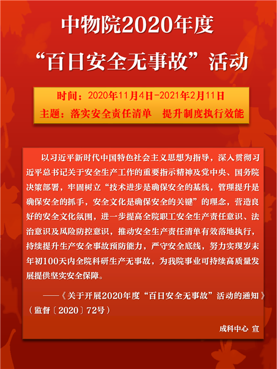 为贯彻院关于开展2020年度“百日安全无事故”活动的要求,进一步落实中心的安全管理职责,11月18日,成科中心召开安委会暨“百安”活动启动会。中心党委书记、主任,安委会主任刘彤主持会议。