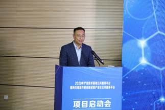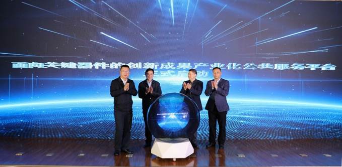 (王卫明、翟刚、蒋黎旺、刘彤共同按动项目启动球,宣告“2020年产业技术基础公共服务平台项目-面向关键器件的创新成果产业化公共服务平台”项目正式启动)