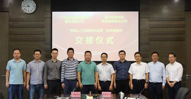近日,四川双银创促科技有限责任公司与广州淡水源科技技术服务有限公司就“高端人工玉陶技术”转让项目完成了技术资料及样品的交接,交接仪式在银河·596科技园科研综合楼三楼五会议室举行,中物院成都科技中心党委书记、主任刘彤,高级科技顾问崔旭东、成果转化与创新体系建设处长冯仕云等相关人员共同见证交接仪式。